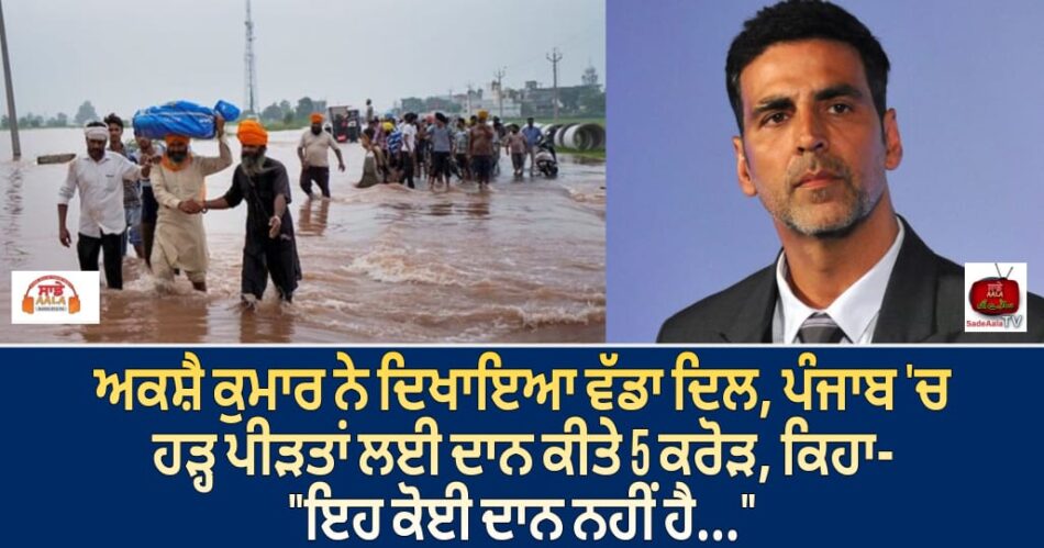 ਭਾਰੀ ਮੀਂਹ ਕਾਰਨ ਪੂਰਾ ਪੰਜਾਬ ਇਨ੍ਹੀਂ ਦਿਨੀਂ ਹੜ੍ਹਾਂ ਦਾ ਸਾਹਮਣਾ ਕਰ ਰਿਹਾ ਹੈ। ਇਸ ਆਫ਼ਤ ਵਿੱਚ 43 ਲੋਕਾਂ ਦੀ ਜਾਨ ਚਲੀ ਗਈ ਹੈ। 23 ਜ਼ਿਲ੍ਹਿਆਂ ਦੇ ਹਜ਼ਾਰਾਂ ਪਿੰਡ ਪੂਰੀ ਤਰ੍ਹਾਂ ਪਾਣੀ ਵਿੱਚ ਡੁੱਬ ਗਏ ਹਨ। ਇਸ ਸੰਕਟ ਵਿੱਚ ਪੰਜਾਬ ਦੇ ਲੋਕਾਂ ਦੀ ਮਦਦ ਲਈ ਬਾਲੀਵੁੱਡ ਵੀ ਅੱਗੇ ਆਇਆ ਹੈ। ਇਸ ਦੌਰਾਨ, ਅਦਾਕਾਰ ਅਕਸ਼ੈ ਕੁਮਾਰ ਨੇ ਲੋਕਾਂ ਦੀ ਮਦਦ ਲਈ 5 ਕਰੋੜ ਰੁਪਏ ਦਾਨ ਕਰਨ ਦਾ ਐਲਾਨ ਕੀਤਾ ਹੈ।