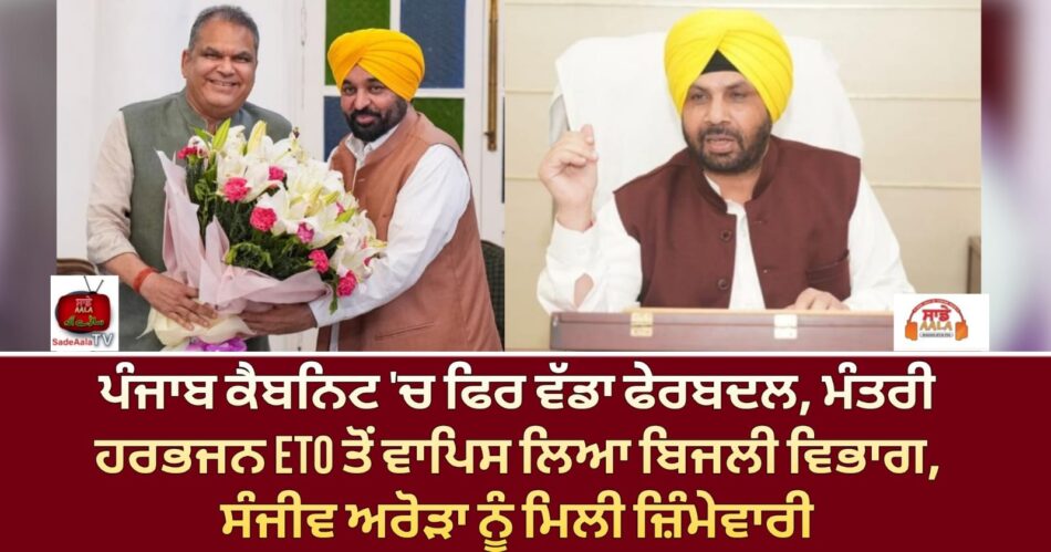 ਪੰਜਾਬ ਦੀ ਆਮ ਆਦਮੀ ਪਾਰਟੀ (ਆਪ) ਸਰਕਾਰ ਨੇ ਇੱਕ ਵਾਰ ਫਿਰ ਮੰਤਰੀ ਮੰਡਲ ਵਿੱਚ ਵੱਡਾ ਫੇਰਬਦਲ ਕੀਤਾ ਹੈ। ਲੁਧਿਆਣਾ ਉਪ ਚੋਣ ਵਿੱਚ ਭਾਰੀ ਜਿੱਤ ਪ੍ਰਾਪਤ ਕਰਨ ਵਾਲੇ ਸੰਜੀਵ ਅਰੋੜਾ ਨੂੰ ਬਿਜਲੀ ਮੰਤਰੀ ਬਣਾਇਆ ਗਿਆ ਹੈ। ਮੰਤਰੀ ਹਰਭਜਨ ਸਿੰਘ ਈਟੀਓ ਤੋਂ ਬਿਜਲੀ ਵਿਭਾਗ ਵਾਪਸ ਲੈ ਲਿਆ ਗਿਆ ਹੈ ਅਤੇ ਉਨ੍ਹਾਂ ਦੀ ਜਗ੍ਹਾ ਸੰਜੀਵ ਅਰੋੜਾ ਨੂੰ ਬਿਜਲੀ ਵਿਭਾਗ ਦੀ ਜ਼ਿੰਮੇਵਾਰੀ ਸੌਂਪੀ ਗਈ ਹੈ। ਹਰਭਜਨ ਸਿੰਘ ਈਟੀਓ ਹੁਣ ਸਿਰਫ਼ ਲੋਕ ਨਿਰਮਾਣ ਵਿਭਾਗ ਦਾ ਕੰਮ ਦੇਖਣਗੇ।