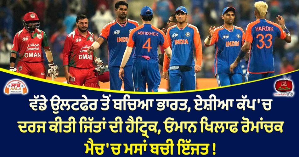 ਟੀਮ ਇੰਡੀਆ ਨੇ ਏਸ਼ੀਆ ਕੱਪ 2025 ਵਿੱਚ ਆਪਣਾ ਆਖਰੀ ਲੀਗ ਮੈਚ ਵੀ ਜਿੱਤ ਲਿਆ ਹੈ। ਅਬੂ ਧਾਬੀ ਵਿੱਚ ਖੇਡੇ ਗਏ ਮੈਚ ਵਿੱਚ ਭਾਰਤ ਨੇ ਓਮਾਨ ਨੂੰ 21 ਦੌੜਾਂ ਨਾਲ ਹਰਾਇਆ। ਪਹਿਲਾਂ ਬੱਲੇਬਾਜ਼ੀ ਕਰਦੇ ਹੋਏ ਭਾਰਤ ਨੇ 188 ਦੌੜਾਂ ਬਣਾਈਆਂ ਪਰ ਜਵਾਬ ਵਿੱਚ ਓਮਾਨ ਦੇ ਬੱਲੇਬਾਜ਼ਾਂ ਨੇ ਜ਼ਬਰਦਸਤ ਪ੍ਰਦਰਸ਼ਨ ਕੀਤਾ ਅਤੇ ਸਾਰਿਆਂ ਦਾ ਦਿਲ ਜਿੱਤ ਲਿਆ। ਓਮਾਨ ਨੇ 20 ਓਵਰਾਂ ਵਿੱਚ 4 ਵਿਕਟਾਂ ‘ਤੇ 167 ਦੌੜਾਂ ਬਣਾਈਆਂ। ਓਮਾਨ ਲਈ 43 ਸਾਲਾ ਖਿਡਾਰੀ ਆਮਿਰ ਕਲੀਮ ਨੇ ਸਭ ਤੋਂ ਵੱਧ 64 ਦੌੜਾਂ ਬਣਾਈਆਂ। ਹਮਦ ਮਿਰਜ਼ਾ ਨੇ ਵੀ 33 ਗੇਂਦਾਂ ਵਿੱਚ 51 ਦੌੜਾਂ ਬਣਾਈਆਂ। ਜਤਿੰਦਰ ਸਿੰਘ ਨੇ 33 ਗੇਂਦਾਂ ਵਿੱਚ 32 ਦੌੜਾਂ ਬਣਾਈਆਂ। ਭਾਰਤ ਦੀ ਗੇਂਦਬਾਜ਼ੀ ਔਸਤ ਰਹੀ। ਹਾਰਦਿਕ ਪੰਡਯਾ, ਅਰਸ਼ਦੀਪ ਸਿੰਘ, ਹਰਸ਼ਿਤ ਰਾਣਾ ਅਤੇ ਕੁਲਦੀਪ ਯਾਦਵ ਨੇ 1-1 ਵਿਕਟ ਹਾਸਿਲ ਕੀਤੀ।