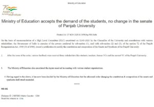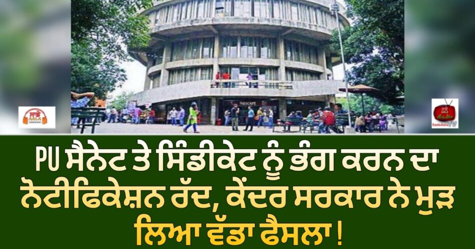 ਪੰਜਾਬ ਯੂਨੀਵਰਸਿਟੀ ਨੂੰ ਲੈ ਕੇ ਕੇਂਦਰ ਸਰਕਾਰ ਵੱਲੋਂ ਸ਼ੁੱਕਰਵਾਰ ਦੇਰ ਸ਼ਾਮ ਇੱਕ ਨਵਾਂ ਨੋਟੀਫਿਕੇਸ਼ਨ ਜਾਰੀ ਕਰ ਦਿੱਤਾ ਗਿਆ ਹੈ। ਇਸ ਨੋਟੀਫਿਕੇਸ਼ਨ ਵਿਚ ਕਿਹਾ ਗਿਆ ਹੈ ਕਿ ਸੈਨੇਟ ਭੰਗ ਕਰਨ ਦਾ ਫੈਸਲਾ ਵਾਪਸ ਲੈਣ ਦੇ ਨਾਲ-ਨਾਲ ਪੁਰਾਣੀ ਸੈਨੇਟ ਤੇ ਸਿੰਡੀਕੇਟ ਆਪਣੇ ਅਹੁਦੇ ਉੱਤੇ ਬਰਕਰਾਰ ਰਹਿਣਗੇ। ਸੈਨੇਟ ਮਾਮਲੇ ‘ਤੇ ਕੇਂਦਰ ਸਰਕਾਰ ਨੇ ਯੂਟਰਨ ਲਿਆ ਹੈ। ਇਸ ਸਬੰਧੀ ਕੇਂਦਰ ਸਰਕਾਰ ਨੇ ਨੋਟੀਫਿਕੇਸ਼ਨ ਜਾਰੀ ਕੀਤਾ ਹੈ। ਪੰਜਾਬ ਯੂਨੀਵਰਸਿਟੀ ਦੀ ਸੈਨਟ ਅਤੇ ਸਿੰਡੀਕੇਟ ਨੂੰ ਭੰਗ ਕਰਨ ਦੇ ਮਾਮਲੇ ‘ਤੇ ਵਿਦਿਆਰਥੀਆਂ ਅਤੇ ਸਿਆਸੀ ਪਾਰਟੀਆਂ ਵੱਲੋਂ ਲਗਾਤਾਰ ਇਸ ਫੈਸਲੇ ਦਾ ਵਿਰੋਧ ਕੀਤਾ ਜਾ ਰਿਹਾ ਸੀ। ਕਈ ਜਥੇਬੰਦੀਆਂ ਨੇ 10 ਨਵੰਬਰ ਨੂੰ ਯੂਨੀਵਰਸਿਟੀ ਬੰਦ ਕਰਨ ਦਾ ਐਲਾਨ ਵੀ ਕੀਤਾ ਸੀ ਹਾਲਾਂਕਿ ਹੁਣ ਜਥੇਬੰਦੀਆਂ ਈ ਕੀ ਰਣਨੀਤੀ ਰਹੇਗੀ ਇਹ ਵੀ ਦੇਖਣਾ ਹੋਵੇਗਾ।