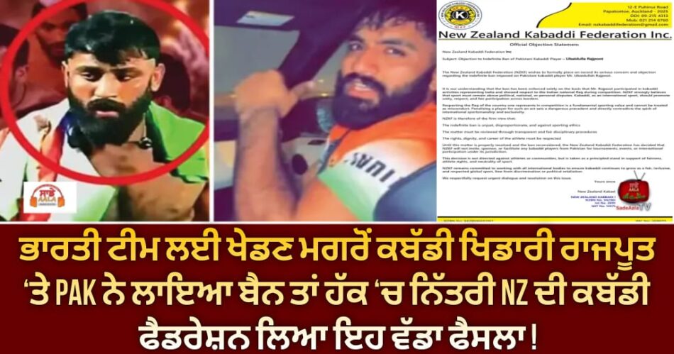 ਪਿੱਛਲੇ ਦਿਨੀ ਪਾਕਿਸਤਾਨ ਦੇ ਅੰਤਰਰਾਸ਼ਟਰੀ ਕਬੱਡੀ ਖਿਡਾਰੀ ਉਬੈਦੁੱਲਾ ਰਾਜਪੂਤ ‘ਤੇ ਬਹਿਰੀਨ ਵਿੱਚ ਹੋਏ ਟੂਰਨਾਮੈਂਟ ਦੌਰਾਨ ਭਾਰਤੀ ਜਰਸੀ ਪਾਉਣ ਅਤੇ ਭਾਰਤੀ ਝੰਡਾ ਲਹਿਰਾਉਣ ਲਈ ਪਾਕਿ ਦੀ ਰਾਸ਼ਟਰੀ ਫੈਡਰੇਸ਼ਨ ਨੇ ਅਣਮਿੱਥੇ ਸਮੇਂ ਲਈ ਪਾਬੰਦੀ ਲਗਾਈ ਸੀ। ਇਸ ਪਾਕਿਸਤਾਨੀ ਖਿਡਾਰੀ ਦੀ ਦੁਨੀਆ ਭਰ ਵਿੱਚ ਚਰਚਾ ਹੋ ਰਹੀ ਹੈ। ਪਰ ਹੁਣ ਬੈਨ ਮਗਰੋਂ ਉਬੈਦੁੱਲਾ ਰਾਜਪੂਤ ਦੇ ਹੱਕ ‘ਚ ਨਿਊਜ਼ੀਲੈਂਡ ਦੀ ਕਬੱਡੀ ਫੈਡਰੇਸ਼ਨ ਨਿੱਤਰੀ ਹੈ, ਫੈਡਰੇਸ਼ਨ ਨੇ ਉਬੈਦੁੱਲਾ ਰਾਜਪੂਤ ਤੋਂ ਬੈਨ ਹਟਾਉਣ ਦੀ ਮੰਗ ਕਰਦੇ ਹੋਏ ਨਿਊਜ਼ੀਲੈਂਡ ‘ਚ ਸਾਰੇ ਪਾਕਿਸਤਾਨੀ ਖਿਡਾਰੀਆਂ ਨੂੰ ਬੈਨ ਕਰ ਦਿੱਤਾ ਹੈ।