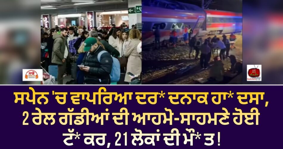 ਦੱਖਣੀ ਸਪੇਨ ‘ਚ ਐਤਵਾਰ (18 ਜਨਵਰੀ, 2026) ਨੂੰ ਇੱਕ ਦਰਦਨਾਕ ਰੇਲ ਹਾਦਸਾ ਵਾਪਰਿਆ ਹੈ। ਕੋਰਡੋਬਾ ਪ੍ਰਾਂਤ ਵਿੱਚ ਦੋ ਤੇਜ਼ ਰਫ਼ਤਾਰ ਰੇਲਗੱਡੀਆਂ ਦੀ ਆਹਮੋ-ਸਾਹਮਣੇ ਟੱਕਰ ਹੋਣ ਕਾਰਨ ਘੱਟੋ-ਘੱਟ 21 ਲੋਕਾਂ ਦੀ ਮੌਤ ਹੋ ਗਈ ਅਤੇ ਕਈ ਹੋਰ ਗੰਭੀਰ ਜ਼ਖਮੀ ਹੋ ਗਏ। ਐਸੋਸੀਏਟਿਡ ਪ੍ਰੈਸ ਦੇ ਅਨੁਸਾਰ, ਇਸਨੂੰ ਹਾਲ ਹੀ ਦੇ ਸਾਲਾਂ ਵਿੱਚ ਸਪੇਨ ਦੇ ਸਭ ਤੋਂ ਘਾਤਕ ਰੇਲ ਹਾਦਸਿਆਂ ਵਿੱਚੋਂ ਇੱਕ ਮੰਨਿਆ ਜਾ ਰਿਹਾ ਹੈ।