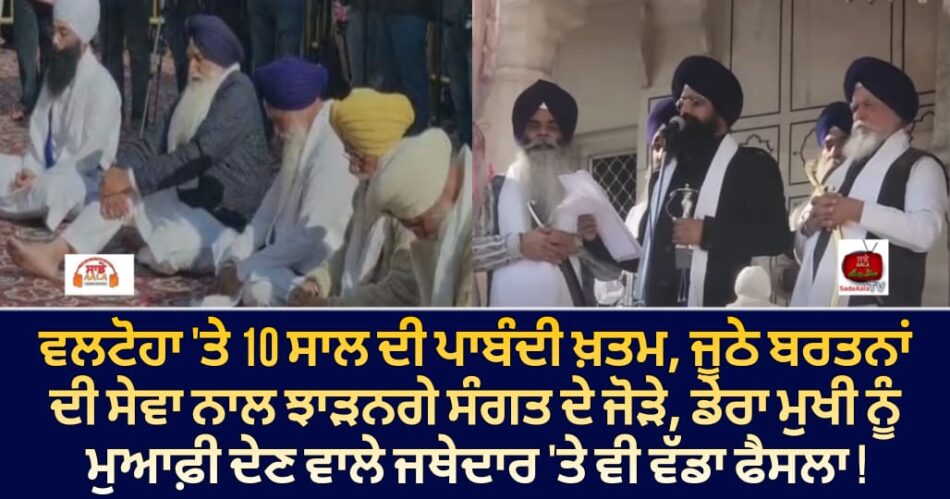 ਸ੍ਰੀ ਅਕਾਲ ਤਖ਼ਤ ਸਾਹਿਬ ਅੱਗੇ ਪੇਸ਼ ਹੋ ਕੇ ਵਿਰਸਾ ਸਿੰਘ ਵਲਟੋਹਾ ਨੇ ਮੁਆਫ਼ੀ ਮੰਗੀ ਹੈ। ਜਥੇਦਾਰ ਗਿਆਨੀ ਕੁਲਦੀਪ ਸਿੰਘ ਗੜਗੱਜ ਨੇ ਵਲਟੋਹਾ ਨੂੰ ਸਪੱਸ਼ਟ ਆਦੇਸ਼ ਦਿੱਤਾ ਕਿ ਉਹ ਧਾਰਮਿਕ ਸ਼ਖਸੀਅਤਾਂ ਬਾਰੇ ਕੋਈ ਬਿਆਨਬਾਜ਼ੀ ਨਾ ਕਰਨ। ਵਿਰਸਾ ਸਿੰਘ ਵਲਟੋਹਾ ‘ਤੇ ਲੱਗੀ 10 ਸਾਲ ਲਈ ਅਕਾਲੀ ਦਲ ਵਿੱਚੋਂ ਕੱਢੇ ਜਾਣ ਦੀ ਪਾਬੰਦੀ ਹਟਾ ਦਿੱਤੀ ਗਈ ਹੈ। ਇਸ ਪਾਬੰਦੀ ਨੂੰ ਹਟਾਉਣ ਦੇ ਨਾਲ ਵਲਟੋਹਾ ਦਾ ਅਕਾਲੀ ਦਲ ਵਿੱਚ ਮੁੜ ਸ਼ਾਮਿਲ ਹੋਣ ਦਾ ਰਸਤਾ ਹੁਣ ਖੁੱਲ੍ਹ ਗਿਆ ਹੈ। ਜਥੇਦਾਰ ਕੁਲਦੀਪ ਸਿੰਘ ਗੜਗੱਜ ਨੇ ਵਿਰਸਾ ਸਿੰਘ ਵਲਟੋਹਾ ਦੀ ਮੁਆਫ਼ੀ ਕਬੂਲ ਕੀਤੀ ਅਤੇ ਧਾਰਮਿਕ ਸਜ਼ਾ ਲਗਾਉਂਦੇ ਹੋਏ 3 ਦਿਨ ਸ੍ਰੀ ਦਰਬਾਰ ਸਾਹਿਬ ’ਚ ਜੂਠੇ ਭਾਂਡੇ ਮਾਂਜਣ ,ਇੱਕ ਘੰਟਾ ਸੰਗਤ ਦੇ ਜੋੜੇ ਝਾੜਨ ਦੀ ਸੇਵਾ ਲਗਾਈ ਗਈ ਅਤੇ 11 ਦਿਨ ਰੋਜ਼ਾਨਾ ਗੁਰਬਾਣੀ ਦਾ ਜਾਪ ਕਰਨਗੇ। ਧਾਰਮਿਕ ਸਜ਼ਾ ਪੂਰੀ ਹੋਣ ਮਗਰੋਂ 1100 ਰੁ. ਦੀ ਦੇਗ ਤੇ 1100 ਰੁ. ਗੋਲਕ ’ਚ ਪਾਉਣ ਦੇ ਆਦੇਸ਼ ਦਿੱਤੇ ਗਏ ਹਨ।